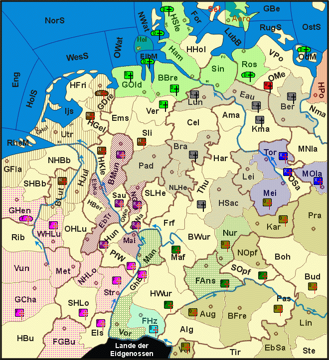Frankreich (F)  | A FreiGf Burgund - Elsass F Gf Hennegau Hold A Hz Burgund - Gf Champagne A Noerdliches Hz Lothringen - Pfaelzer Wald A Pfaelzer Wald - Ghz Baden A Strassburg Supports A Pfaelzer Wald - Ghz Baden A Suedliches Hz Lothringen Supports A FreiGf Burgund - Elsass A westliches Hz Luxemburg Hold | 8 | 1 |