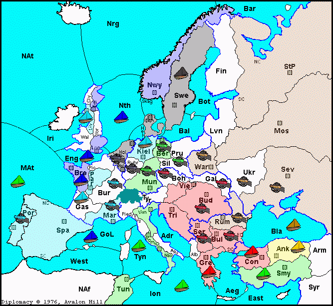 F English Channel Supports F Mid-Atlantic Ocean - Brest F Gulf of Lyon - Spain(sc) (*Bounce*) F Mid-Atlantic Ocean - Brest F North Sea - Denmark (*Bounce*)