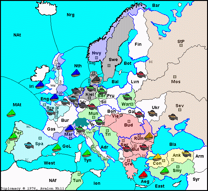 A Berlin Supports A Munich - Kiel F Gulf of Lyon Supports A Spain - Marseilles (*Void*) A Munich - Kiel F Naples - Tyrrhenian Sea F Portugal Hold F Smyrna Supports F Aegean Sea - Constantinople (*Cut*) A Trieste - Tyrolia A Venice - Piedmont A Warsaw - Moscow (*Bounce*) F Western Mediterranean - Mid-Atlantic Ocean