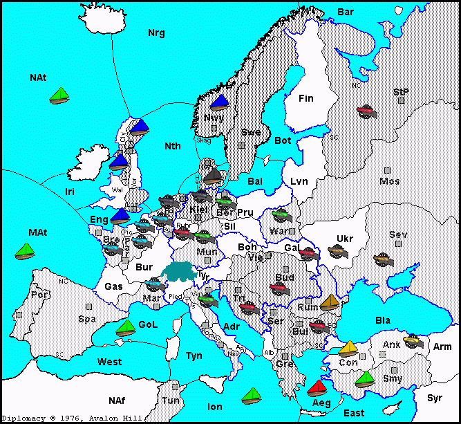 A Berlin Supports A Kiel F Gulf of Lyon Supports A Spain - Marseilles A Kiel Supports A Munich - Ruhr (*Dislodged*) F Mid-Atlantic Ocean - North Atlantic Ocean A Piedmont - Venice F Portugal - Mid-Atlantic Ocean F Smyrna Supports F Aegean Sea - Constantinople A Tyrolia - Bohemia F Tyrrhenian Sea - Ionian Sea A Warsaw - Moscow (*Bounce*)